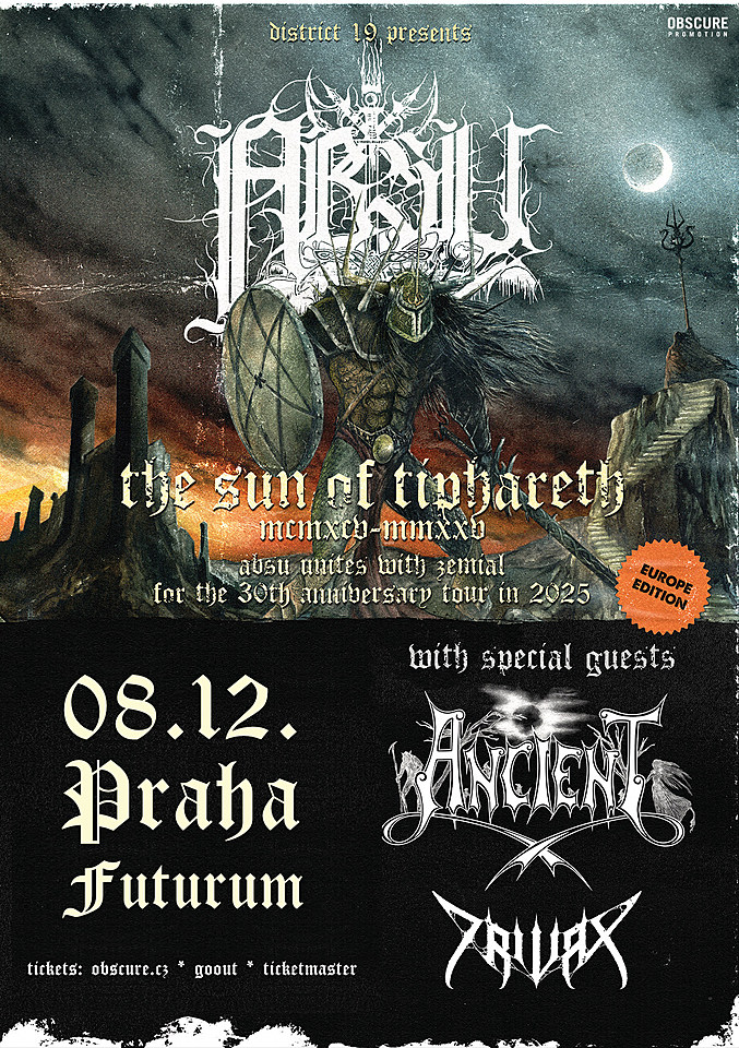 Legendární black/thrash metalová formace ABSU se vrací na světová pódia! V rámci série koncertů na oslavu 30. výročí vydání legendárního alba The Sun of Tiphareth na podiu doplní Proscriptora veteráni řecké blackové scény Zemial, čímž společně poskládají impozantní koncertní sestavu - to vše 8. prosince ve Futurum Music Bar.