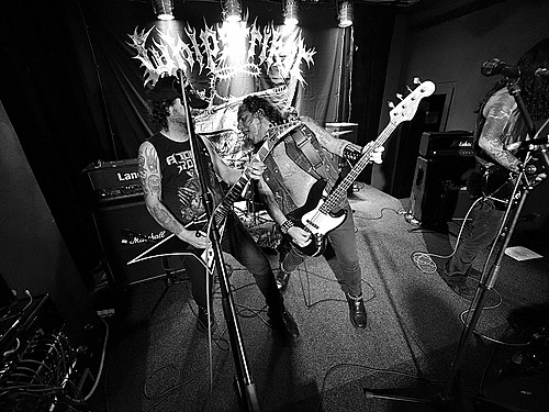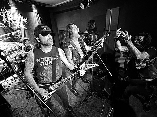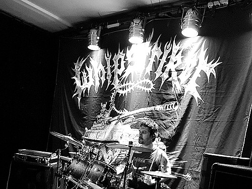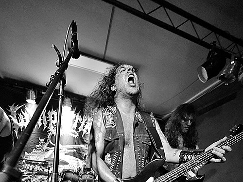 Zbylé dvě třetiny hracího času byly v režii brazilských kapel na evropském tour WHIPSTRIKER a APOKALYPTIC RAIDS. Obě z Rio de Janeira, do Písku zavítaly znovu po devíti letech. WHIPSTRIKER během cca 40 minut vystavěli archeologickou strukturou thrashe, speedu a punk/rock´n´rollu. Zpěvák a baskytarista pan Whipstriker vyzařoval kultem osobnosti, kterým na brazilské undergroundové scéně je. Tím nemyslím aroganci, nadřazenost nebo manýry mistra světa ve všem. Srandičky, grimasy, „přísná“ gesta, stékající pot, ale hlavně přesvědčivý zpěv. Baskytara na jeho krku byla čitelná až při větším odstupu od pódia, ale fyzikální zákony metal obecně popírat nehodlá. Z každého tónu byla cítit sebejistota a divokost, o kterou se WHIPSTRIKER dělili s publikem v čele s hlavním choreografem Tomem Weyškou, který svou tělesnou konstitucí budí respekt a zároveň úctu k jeho oddanosti žánru. Myslím, že s tou jeho fyzickou konstitucí to bývalo horší (úsměv)... WHIPSTRIKER se podařilo čapnout primitivní zvuk a vytvořit vintage variaci s temně kovovým odleskem. To samé se dalo očekávat od následujících APOKALYPTIC RAIDS.