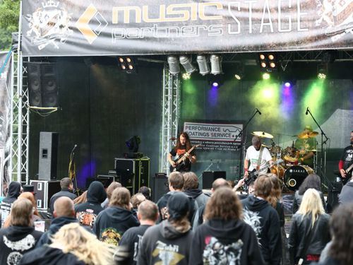Následně jsme se vydali do města na snídani (chlebíčky, zmrzlina, lízátko Chupa Chups, mlíčko Müller Milch a banán… no prostě taková normální neprojímavá kombinace) a do areálu jsme zpět dorazili akorát na vystoupení první zahraniční skvadry dne – nizozemské BLOODPHEMY. Borci z Amersfoortu mají za sebou dlouhou a zároveň krátkou historii, když se v roce 2000 dali dohromady, nahráli demo, v r. 2003 se rozpadli a před dvěma lety se rozhodli zkusit znovu. Letos jim vyšlo debutové album „Bloodline“ a logicky byl tedy setlist napěchován skladbami z něj. Death metal nizozemské školy nezněl špatně, ale po pár skladbách docela monotónně. Bylo to zkrátka dobře zahrané, leč pořád stejné, a tak těch 45 minut času bylo vlastně až dost. Větší variabilita by kompozicím určitě prospěla, ale pánové to berou pěkně od podlahy a to má své kouzlo.