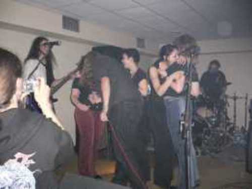 Předposlední F.O.B., hrálo se opět téměř jen z nové desky ?default?, zhruba v polovině setu jsme ještě i na téhle párty pokřtili novou desku. Poté bylo na pořadí ještě překvapení večera pro Ifu od kámošek a přítelkyně Jany. Pro mě však zklamání, nejdříve to opravdu vypadalo slibně, ale pak se to zvrhlo :). Holky přinesly na pódium šlehačku ve spreji a teď to přijde, teda myslel jsem že to přijde, a sice, že si holky vyhrnou trička a na prsa si pěkně šlehačku nastříkají,... no holky si sice trička vyhrnuly, ale k mému zklamání seshora a šlehačka tak přišla jen nad prsa, no nuda,... a Ifa (dal nohy na ramena) a lízal a lízal.... pardón, to je odjinud, mnooo, ale slízal to skoro všechno :-) poté F.O.B. pokračovali v rozjetém setu, a až k jeho konci přizvali opět Ifu na pódium, aby s nima zapěl Time Runs So Slowly.