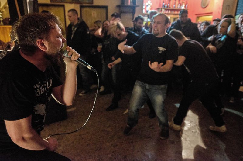 Knír. Ten zatracenej knír. Pořád mi vrtalo hlavou, kde já ten knír a nového zpěváka DECULTIVATE už viděl a nemohl si vzpomenout, až mi musel napovědět Vrablo. Novým vokalistou je Zdenda, jinak tlučmistr z doomových GEDALE, a já ho viděl na fotce, když jsem si pouštěl Špínu na radiu Wave, ve které byl hostem. Jinak mě kníry docela děsí a mám k nim dost velkou nedůvěru. Momentálně je to třeba ten nejpopulárnější. Ten, který pomátl dost lidí a dostává Oscary... Nicméně Zdendův kňour do DECULTIVATE, zdá se, zapadl výborně. Nahradit předchozího úderníka za mikrofonem nebylo jistě snadné, ale povedlo se. To stejné jde říct o tahu s basou. Toto prázdné místo vyplnil Ondra, jinak též známý ze sta dalších kapel a jiných aktivit (třeba těch pisatelských). Úderné duo kytara/bicí tak bylo vhodně doplněno, což ještě znásobilo energickou hudební smršť. Kapela drtila nejen svým masivním zvukem (kolena mi vibrovala), ale hlavně svojí nekompromisní muzikou, kde se grind sypce potkávaly s math hardcore zběsilostí, takže si každý musel těch výživných patnáct minut užít. Jestliže jde na konto DECULTIVATE ze všech stran chvála, je potřeba se s ní ztotožnit. Je zasloužená a nezbývá než pogratulovat k novému upgrade, jenž se náramně vydařil. Stejně jako hospodský set, který zůstane dlouho archivován v mojí hlavě.