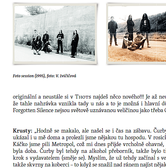 Velkým kladem knihy je, že jde do podrobností, takže ideální je si při čtení pustit dané album a při poslechu si číst, jak se skládaly písně, jak se měnila sestava, jaké peripetie se odehrály při nahrávání, výrobě obalů, focení do bookletů, prostě taková ta typická kapelní práce. U FORGOTTEN SILENCE jakožto kapely amébovitého charakteru je všechno mnohem výživnější než u party zakotvené v jednom žánru. Čímž se dostávám k tomu, proč jsem na úvod tohoto článku uvedl pasáž týkající se žánrově nejméně vyhraněné party tuzemského podzemí. Počátky sice ještě nebyly tak kreativní, ale s albem „Thots“ se všechno zlomilo… A nejen o „bodu zlomu“ dokáží Krysty, Medvěd, později Marty, Hanka nebo Chrobis poutavě vyprávět, samozřejmě s jistou dávkou nostalgie, která k tomu patří. Postupně se čtenář díky vkladům dalších osobností dostane do současnosti, až k nešťastnému koronaviru, který zhatil plánované koncerty na významných festivalech.