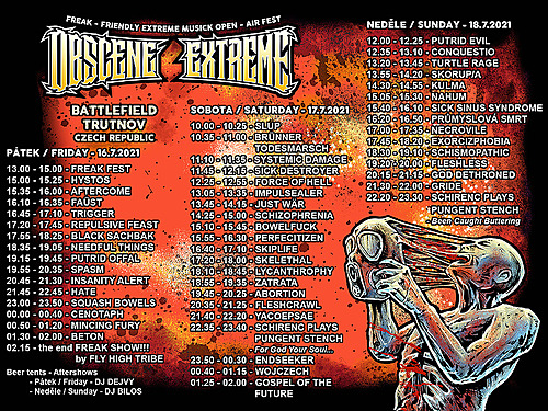 Zmenšení doznalo i pódium (a prý se i uvažovalo o valníku, na kterém proběhly první ročníky), na kterém v době našeho příchodu měla dle programu končit první kapela. Ovšem kvůli nějakým technickým problémům, snad s nehrajícími odposlechy, byl oficiální začátek Obscene Extreme Festivalu pro rok 2021 posunut o sedmdesát minut. Věc zde nevídaná, tak aspoň že to počasí se na celý víkend umoudřilo a ty zhruba dva a půl tisíce dorazivších návštěvníků netrpěly nadbytkem srážek ani tropickými vedry.