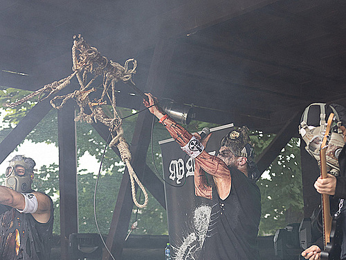 NAURRAKAR – po pátečních MALLEPHYR podobně postižení borci. (úsměv) Opět klobouček; ve vedru pánové neuhnuli a na pódiu se představili v stylovém odění s dlouhými rukávy a hlavně s plynovými maskami, což tedy muselo být podobné peklo, jaké zní z loňského CD „Uranfaust“. NAURRAKAR jsou aktuálně v nejsilnější sestavě i formě, což koncert jednoznačně potvrdil, i v tom parnu to byla jaderná apokalypsa, která opět zabírala i na fanoušky. Nelidský hnusný black metal bez servítků, se spoustou změn jak v hudební, tak ve vokální rovině.