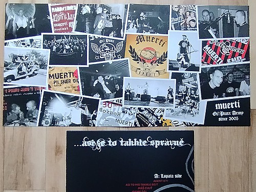 Na neaktuálním „aktuálním“ albu se nachází jedenáct skladeb, které většinou pěkně odsýpají a které se drží podobného mustru, byť nějaké výjimky se najít dají. Úvod alba je v duchu toho odsýpání, „Agent 077“, „Asi to má takhle bejt“ a „Máš chuť“ jsou skočné chytlavé kousky, které toho Oi! příliš, kromě sloganu v „Máš chuť“, neobsahují, spíše se jedná o punkové až pubrockové halekačky, které v dobové recenzi kolega Mikael přirovnal k ranému ALKEHOLU. A tohle srovnání mi nepřijde mimo mísu, rychlé písničky MUERTI nemají k těm ALKEHOLICKÝM daleko, navíc často používají podobný textový základ týkající se hospod, alkoholu a holek. S čtvrtou „Jdeme dál“ a pátou „Proč?“ nastavuje kapela druhou tvář, skladby jsou pomalejší, punkrockové, melodičtější, ale taky se v nich dají najít halekací refrény, navíc i kytarové vyhrávky, které nemají daleko k metalu. Závěr strany A, pojmenované Lopata side podle části textu v titulní písni, obstarává další hospodská vyřvávačka.