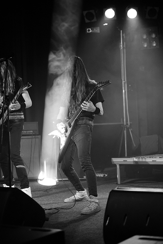 Zbývající dvě kapely mají sice stejného zpěváka, kterým je Radek Popel, ale žánrově si moc blízké nejsou. První z nich, TAEDIFER, coby předposlední vystupující večera, pro naši osádku zároveň i poslední, pohodlně naskočili na švédskou deathmetalovou hydru řízenou pedálem HM2. TAEDIFER nahráli v roce 2022 2skladbové demo „Demons of the Past“ a od té doby se nic převratného neudálo. Kromě Radka se zde sešla plejáda muzikantů z GUTALAX, LOCOMOTIVE, DARK ANGELS, BONE ORCHARD, THE OLD FOUR, INGROWING. Problém se strunou baskytary Pavla Troupa z toitoikových GUTALAX neměl na funkci žádný vliv, prostě chvilku odehráli bez basy. Co se týče kytarové práce, spousta změn tempa, ne úplně drastických jako v progresivním smyslu, ale z hlediska brutality vypovídající. Na druhou stranu jsem si jistý, že bez nějakého výrazného nápadu by mě pouze válec ke spokojenosti nestačil. (Jindra)