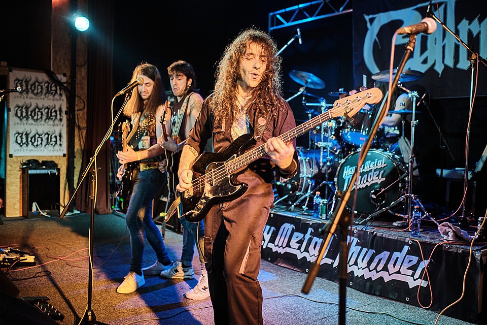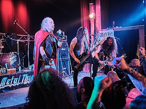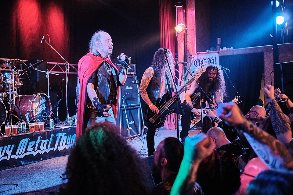 Nejočekávanější partou večera pro mě nebyli headlineři MEDIEVAL STEEL, ale FRIENDS OF HELL, do jejichž řad po rozpadu NIFELHEIM vstoupil Hellbutcher, který v roce 2023 nahradil původního pěvce Alberta Witchfindera. V mezinárodní sestavě fungují muzikanti ze Švédska, Řecka, Kypru, Finska i Španělska a drtí starodávný doom metal podobný tomu, co hrávali CATHEDRAL, CANDLEMASS, PENTAGRAM nebo ELECTRIC WIZARD, ostatně bicmen právě v ELECTRIC WIZARD před časem působil. Právě bubeník zaujal zvláštní čelenkou a hojně potetovaným obličejem (v hotelu prý způsobil při přihlašování docela poprask), frontman pak červeným pláštěm s velkým bafometem, ostatní o generaci mladší muzikanti byli oděni civilněji. Od samého začátku sázela kapela jeden silný drtivý riff za druhým, Per do hlučného lomozu kázal silným hlasem a uhrančivé vystoupení drželo všechny přítomné v napětí. Pravda, doom metal není tím hlavním žánrem přehlídky, takže na sále to trochu prořídlo, ale ti, kteří koncert sledovali, byli mnohdy až v extázi. FRIENDS OF HELL taky šikovně pracovali s náladami, nedrželi se jen plíživých temp a sem tam přitopili pod kotlem, a ony i nálady písní se různily, v jednom případě mi to přišlo hozené na sever, jakoby rezonovaly vikinské melodie, jindy to byla spíše Anglie. Myslím, že šlo o velmi dobrý set, který nastavil laťku hodně vysoko.
