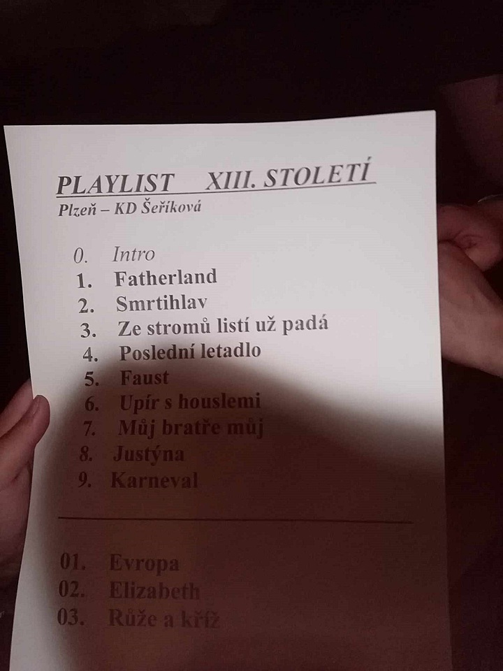 Po trochu delším čekání se s úvodními zvuky rytmické sekce Pavla Štěpána a Mirka Palečka rozjíždí „Fatherland“. XIII. STOLETÍ mě chytlo ihned prvními tóny, vlastně bych mohl říct, že jsem se chytl samotným příchodem Petra Štěpána na pódium. Bavilo mě zde vše, každý zvuk, každé slovo, vizáž členů kapely včetně pohledné klávesistky Andreii Kožené, pohyb a rozvernost basákova, neúnavně přesné bicí a nepochybně zpěvakův projev. Těžko vzpomenout nějaké songy, které bych chtěl slyšet a neslyšel, protože by jich bylo nepřeberné množství, ale ty stěžejní byly odehrány. A to mně stačilo. Nebo ne? Určitě jsem byl rád za oblíbené „Posledni letadlo do Buenos Aires“, které oproti studiovce neztratilo nic na klávesovém naléhavém tónu, ale působilo o trochu tvrději. A znělo to dobře. V úvodu se objevily songy, které mám nejméně naposlouchané, protože poslední album „Noc vlků“ jsem ještě pořádně nevstřebal. Ale abych sebe neklamal, tak musím uznat, že do koncertního setu songy jako „Smrtihlav“ nebo „Ze stromů listí už padá“ zapadly velice dobře. Ba jsem ani nezpozoroval, že to jsou novinkové počiny. Asi největším a emotivním hitem byla pochopitelně skladba „Můj bratře můj“. Koncert uzavřel letitý „Karneval“, přičemž nechyběla ani předchozí víla lesů „Justina“. Nicméně mám však raději temně začínající a krvavější „Elizabeth“, která zazněla až odherání základního setu. Trojici skladeb v přídavku otevřela textově mrazivá a v dnešní době víc aktuální „Evropa“, úplný závěr obstarala akustická věcička „Růže a kříž“. A jakými slovy koncert uzavřít? Byla to rocková tvrdost, punková energie, gotická rozmáchlost. Vše temné jako noc, ale zároveň barevné jako neony měst. Vše v jednom. Zvuk jedna báseň, každému slovu šlo rozumět. Jedním slovem to byl koncert nádherný.