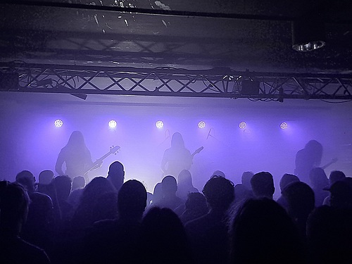 Nicméně – lidské uši si zvyknou na leccos a zvukař si postupně začal zvykat na prostor klubu, takže postupem času se situace zlepšila o dost. Vrchol setu za mě nastal v jeho polovině, a to s dvojicí staré „Vergängnis“ a za mě nejlepší skladby nové desky „Eos“ – to je nájeb jak za starých časů. Silná byla také „Aufbruch“ z desky „Finisterre“, ale celkově set, na to že trval pěkných 90 minut, ubíhal jako voda a nudit se člověk nestihl. A to ani při vizuální podívané, protože i v poměrně skromných možnostech Rock Café se dokázali DER WEG EINER FREIHEIT prezentovat skrze světla velmi působivě. Pomohla tomu spodní „vrstva“ světel, v kombinaci s často k zemi sklopenými vrchními světly, které dělaly spíše takový background Tobiasovi za bicími. Mělo to příhodnou atmosféru. Mimochodem, tenhle borec neztratil za ta léta nic ze své údernosti, sypač jako blázen, zároveň ale velmi kreativní, radost poslouchat. Platí to ale i o novém basákovi Alanovi, jehož nástroj z té chvílemi zvukové koule vykukoval velmi zdárně.