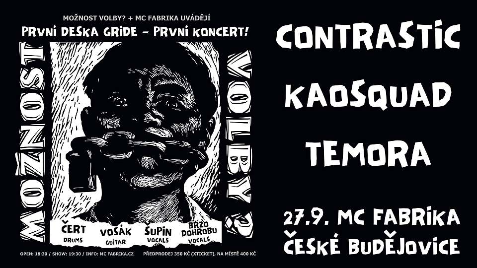 Při dlouhodobé hibernaci kapely GRIDE máme pro (nejen) skalní fanoušky velice příjemnou zprávu. Zakládající člen a bubeník Čert spojil síly s dalšími matadory hardcore/grindcore scény (Vosák a Šupin z LYCANTHROPHY a Brzo DoHrobu z LADY GAZA) a nazkoušeli kompletní první desku Gride s názvem MOŽNOST VOLBY?. O víkendu natočili dvě ukázky (můžeš už teď vidět a slyšet - odkaz lítá všude) a rozhodli se domluvit pár speciálních koncertů na počest tohoto alba. Chceš slyšet tuhle kultovní desku živě v této raritní sestavě? Možností moc nebude a jedna z nich je právě v pátek 27.9. v českobudějovické Fabrice, navíc ve společnosti hodně speciálních hostů, kterými jsou legendární CONTRASTIC, blatenští zabijáci KAOSQUAD a domácí čerstvá krev TEMORA!!! Tady zkrátka nesmíš chybět.