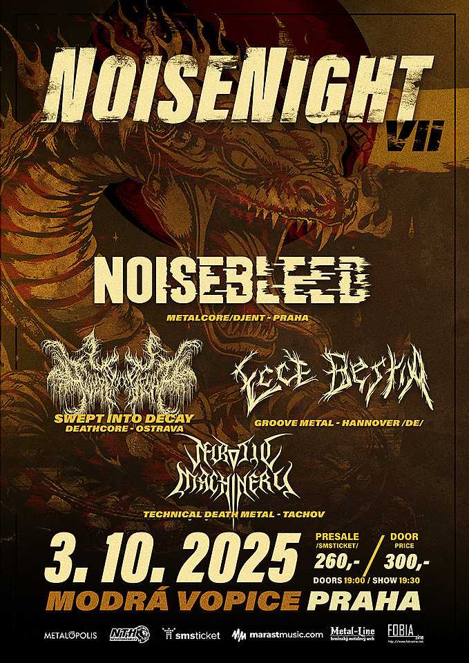 Pražská Modrá Vopice se v pátek 3. října stane dějištěm sedmého pokračování koncertní série Noisenight, za kterou stojí domácí metalcore/djent kapela Noisebleed. Čeká vás čtyřnásobná porce tvrdé muziky – od technického deathu přes deathcore až po groove metal z Německa.