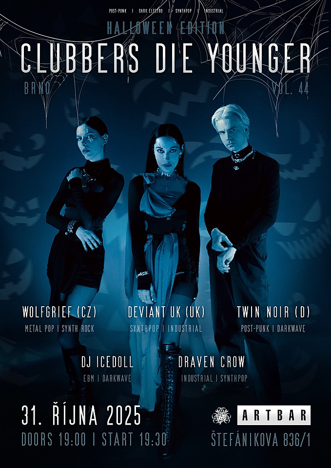 Brno, 31. října 2025 – Kultovní brněnský akce pro fanoušky temnějších hudebních žánrů se vrací. CLUBBERS DIE YOUNGER vol. 44 proběhne právě tehdy, kdy se každý může obléct, jak se mu zlíbí a světu to přijde normální: na Halloween.