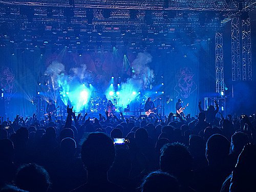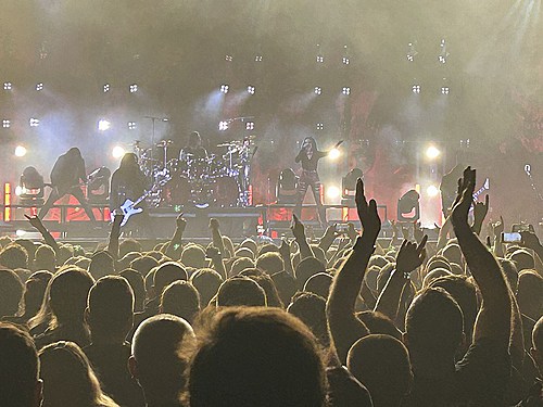 Scéna se zavřela plachtou s nápisem „Pure Fucking Metal“ a bylo jasné, co přijde následně. ARCH ENEMY. Kapela, která je již notně dlouho v laufu, určitě tomu také přidala postava zpěvačky Alissy White-Gluz, která je její součástí už 11 let! Nicméně atraktivita této slečny / dámy je pořád skvělá, ne? Modré vlasy až na zadek, přiléhavá moderně metalová proužkovaná / pocákaná kombinéza, super skvělá fyzická kondice. To vše také patřilo mezi všechny propriety celé show. Show s velkým „S“. Nedá se srovnat světelný park s dosud vystoupivšími kapelami. Rotující lasery, velké plochy světel měnící se ve všech barvách, blikající „teploměry“ evokovaly ohně, reflektory vytvářející pekelný dojem. K tomu si ještě přičtěte o třídu lepší zvuk a skvělé muzikantské výkony. Mezi nimi excelovali především bubeník alias mlátička, kultovní postava dřívějších kapel CARCASS či BRUJERIA – Daniel Erlandsson a brilantní kytarista Michael Amott, vůdčí to postava ARCH ENEMY.
