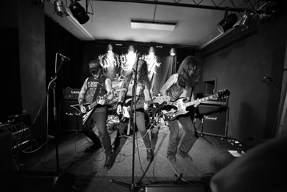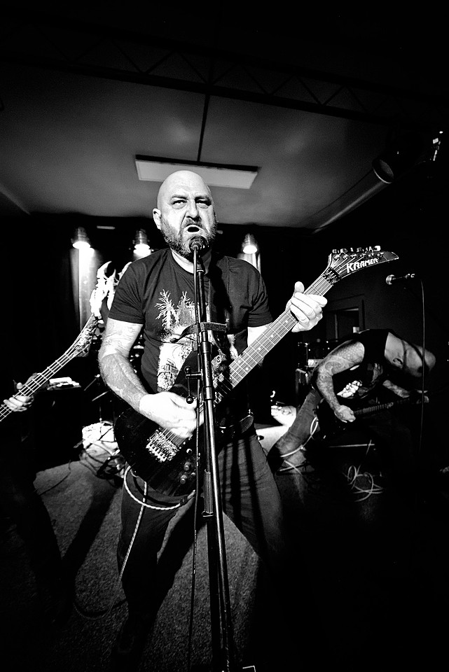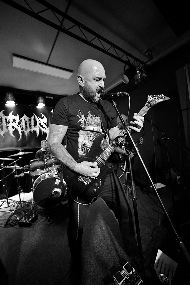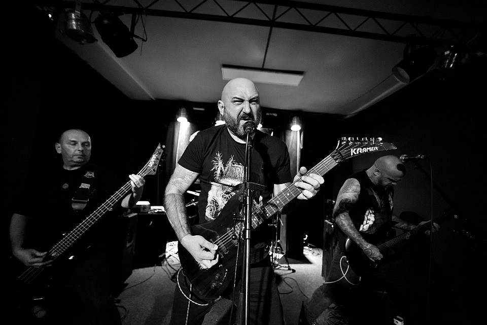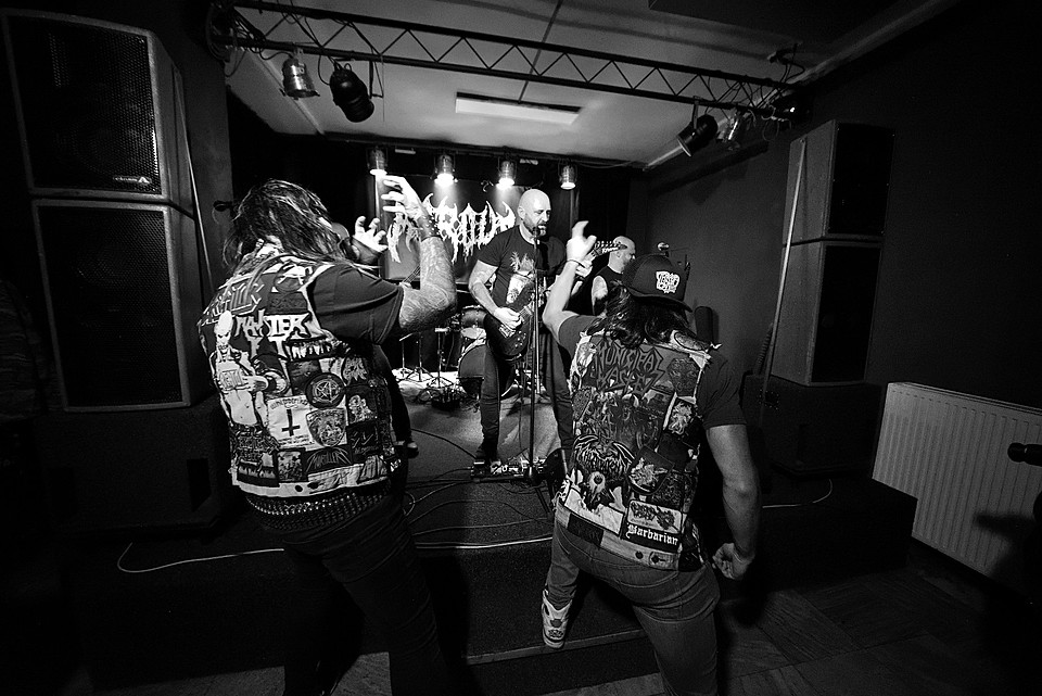 Krátce po 19. hodině to odpálili MOROUS, kteří už to drhnou cca rok, během kterého jsem je viděl třikrát ve třech. Leč sestava se rozrostla o Rámuse (BOHEMYST), takže čtvrté setkání bylo jiné. Rámus se chopil baskytary (podobně jako v MASTER´S HAMMER) a ještě více zahustil sound deathmetalové party, která to mydlí v staroškolském duchu a moc se s tím nepáře. Tentokrát jsem nebyl úplně nadšený ze zvuku, který byl lehce zahuhlaný, ale dojem to až tak nekazilo, „MOROUSOVÉ“ to prostě valili a valili, o vokály se dělili oba kytaristé, přičemž oba ta chrlili zhluboka a já vzpomínal na jejich začátky a Žroutův, jak říkal Korek, hysterák. Škoda, pestřejší hlasy by se mi líbily víc. Co se mi ale líbilo hodně, byla Alešova masáž bicích, tento večer neměl drobný bijec konkurence. Závěrečný cover DEATH nemohl chybět a po třiceti minutách bylo po prvním masakru.