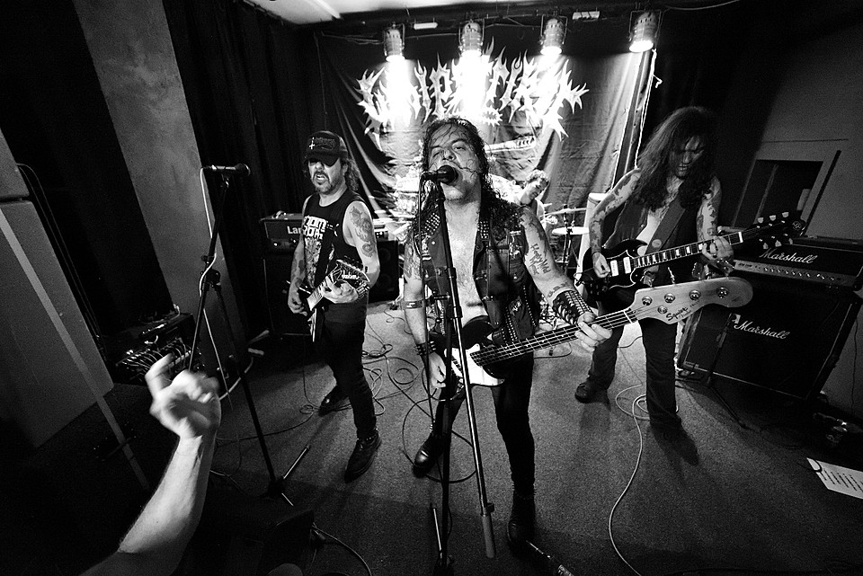 Zbylé dvě třetiny hracího času byly v režii brazilských kapel na evropském tour WHIPSTRIKER a APOKALYPTIC RAIDS. Obě z Rio de Janeira, do Písku zavítaly znovu po devíti letech. WHIPSTRIKER během cca 40 minut vystavěli archeologickou strukturou thrashe, speedu a punk/rock´n´rollu. Zpěvák a baskytarista pan Whipstriker vyzařoval kultem osobnosti, kterým na brazilské undergroundové scéně je. Tím nemyslím aroganci, nadřazenost nebo manýry mistra světa ve všem. Srandičky, grimasy, „přísná“ gesta, stékající pot, ale hlavně přesvědčivý zpěv. Baskytara na jeho krku byla čitelná až při větším odstupu od pódia, ale fyzikální zákony metal obecně popírat nehodlá. Z každého tónu byla cítit sebejistota a divokost, o kterou se WHIPSTRIKER dělili s publikem v čele s hlavním choreografem Tomem Weyškou, který svou tělesnou konstitucí budí respekt a zároveň úctu k jeho oddanosti žánru. Myslím, že s tou jeho fyzickou konstitucí to bývalo horší (úsměv)... WHIPSTRIKER se podařilo čapnout primitivní zvuk a vytvořit vintage variaci s temně kovovým odleskem. To samé se dalo očekávat od následujících APOKALYPTIC RAIDS.