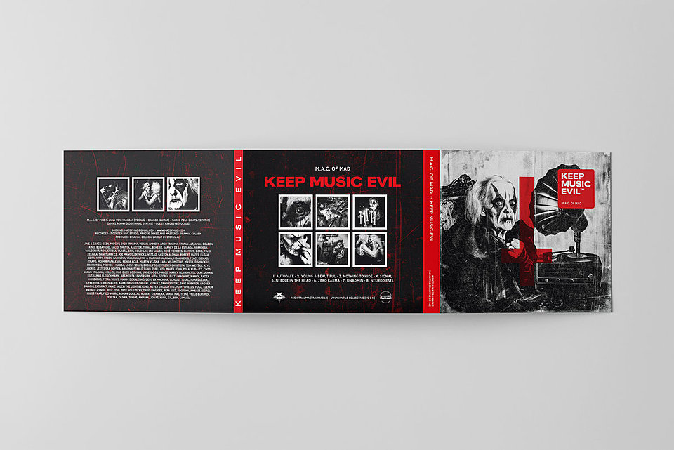 Dívčí vokál, zběsilé beaty, brutální kytara, sžíravé harmonie, punková naléhavost. To je krátká (kapelní) charakteristika současné podoby pražské skupiny M.A.C. OF MAD, jejíž existence letos čítá sedmatřicet let a tři alba. Já si pamatuju hlavně prvotinu „The One“ (2000), která tehdy rezonovala médii, ale pamatuji si ji jako vydaný artikl, nikoliv samotný hudební obsah. Tehdy se ke mně CD samo nedostalo a já jej asi nehledal, takže v hlavě jej mám, obal mám okamžitě před očima (jsou na něm oči). Druhé dílko „Badluck“ už mě minulo, třetí upoutalo okamžitě, když jsem spatřil obal – to je fakt luxus! Stefan Alt si s podobnými motivy občas pohrává, kombinace černobílého základu a červených „přetisků“ u něj není novum, ale ten motiv, ten motiv… Fakt jednička s hvězdičkou. Stefan obstaral cplt design a digipack vypadá opravdu parádně, jen škoda chybějících textů.