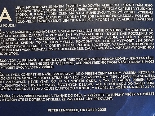 Ano, skladby mají děj, album je totiž koncepční. „Jak je to možné, když je instrumentální?“ možná někoho napadne – a odpověď najde v bookletu. Krátké resumé příběhu je k dispozici slovensky i anglicky, podrobný děj jen anglicky, ale Peter mi ochotně poslal překlad, takže jsem se v příběhu dokázal jakž takž zorientovat, aniž bych ale znal odpovědi na všechny otázky, které mě během čtení napadaly. Je to trochu zamotané, hlavní postava, Valérie, se dostane do opuštěného domu, kde se setká s divným mužem, začte se do knihy, která obsahuje dávnou minulost i případnou budoucnost, pak se dostane do staré neudržované zahrady a prozří… Tolik ve zkratce, ocenění hodné je zejména to, že si kapela dala práci s vymýšlením konceptu a zhudebnila příběh. Pochválit musím i kvalitní obal s hezkým titulním obrázkem, vkusnou grafikou digipacku i bookletu, v němž nechybí žádné podstatné informace. Ani ta týkající se nahrávání, které bylo rozdělené mezi domácí studio a studio RCR, ve kterém se postarali i o mix a mastering. A CD hraje parádně.