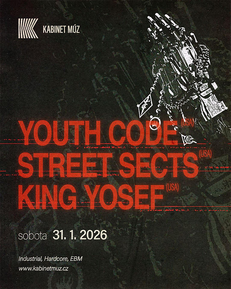 Američtí Youth Code, King Yosef a Street Sects jsou nejvýraznější jména současného industrial hardcore a EBM. S touto trojicí jsme měli možnost se postupně setkat na jejich turné s Health, Perturbator, Converge, Skinny Puppy nebo koncertech po boku Nine Inch Nails. Nyní si tohle smrtelné užijeme 31. ledna v Brně na jediném koncertu v ČR v Kabinetu MÚZ.