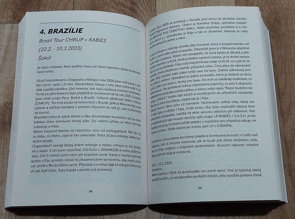 O brazilské anabázi RABIES + CHRUP už jsem četl v Buryzone, kam napsal report Míra (CHRUP), nějaké zážitky popsala zpěvačka RABIES Karolína v Telepatii. Šakal to vzal detailně, den po dni, cesty, nákupy, hospody, kluby, koncerty, zážitky… Jedno velké dobrodružství, o poznání lépe napsané než Mírův report, který mě nebavil. Šakal je detailista, všímá si všeho – docela by mě zajímalo, jestli si dělá podrobné poznámky, třeba každý večer, nebo pak vše doluje z paměti, když to sepisuje. Možná mu pomáhají fotky z akcí, kterých RABIES odehráli asi osm na různých místech s kapelami různých žánrů.