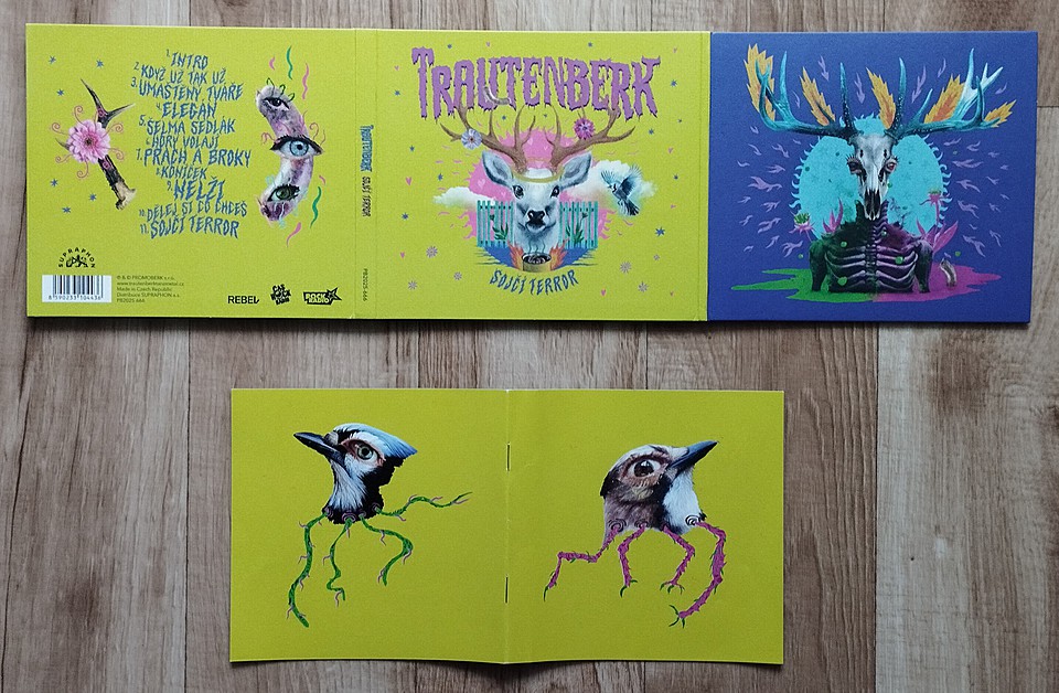 Digipack (vyšla i gramodeska) není ošizený, má šest stran, na vnějších jsou jeleni živí i neživí, sojka, parohy, jitrnice, květy, na vnitřních pokoncertní fotka kapely s dokreslenými srandičkami a sestava. Vložený booklet má šestnáct stran, obsahuje texty, oči, parohy, jitrnici, květy, sojky, fotky, obsahuje i podrobné údaje o nahrávání a seznam hostů, vše potřebné. Autorem grafiky je Daniel Kurz, který odvedl dobré řemeslo, ale na mě je to barevné a přeplácané, není to můj oblíbený vizuální styl.