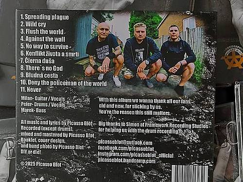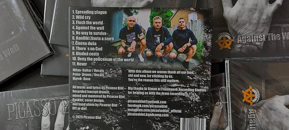 PICASSO BLOT nedisponují početnou diskografií, v roce 2000 debutovali nahrávkou „Daň za život“, o pět let později přibylo druhé (opět pálené) CD „Stav ohrozenia“ a loni, po dvaceti let od předchůdce, nové album „Against The Wall“. To vyšlo na CD vloženém v digipacku a dorazilo poštou ze Stoke-on-Trent, města v anglickém hrabství Staffordshire v regionu West Midlands, s nálepkou Royal Mail. Což je celkem paráda, že CD před přistáním ve schránce ve Strakonicích prošlo institucí s pětisetletou historií. (úsměv)