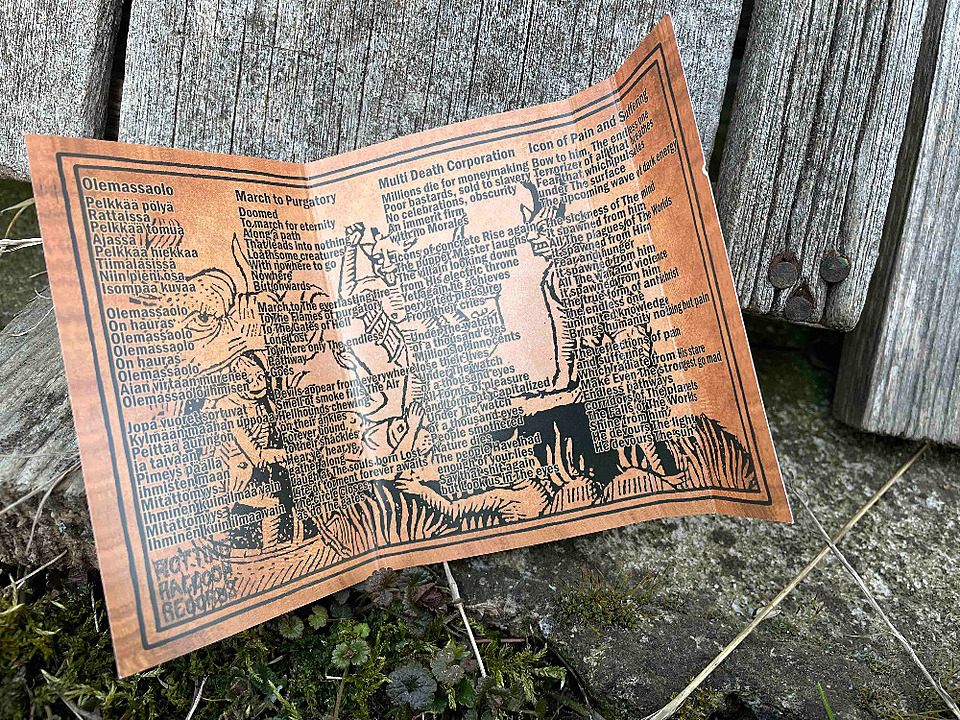 Úvodní „Olemassaolo“, jako jediná tryzna ve finštině, výstižně popisuje, co posluchače čeká. Soundtrack ke karu, který je varovný jako bublající rašeliniště jednoho z tisíce jezer, vypráví zvrácené příběhy o pomíjivosti lidských bytostí. Řezavě vybrnkávaný zvuk kytar projde skrze pochmurnou deklamaci relativně civilním hlasem až k meddley prudkých vyvražďovaček, plíživé smrti a chorobného vokálu – nejpropracovanější kus na ípku. „March to Purgatory“ spojuje ponurý disonantní death/doom s hrdelním zpěvem a vyluzováním mrtvolného chropotu. Ve fofr pasážích se pod tlakem přebuzené kytary vytrácí bicí. Zajímavé jsou cinkavé zvuky basy. V průmyslu bych je přirovnal k otloukání okují po svařování jako známku blízkosti zámečnické dílny. Hodně podobnou, ne-li totožnou funebráckou repetitivní linku je možno zaregistrovat také v „Multi Death Corporation“, která umocňuje a zušlechťuje náladu béčkových hororů. V poslední „Icon of Pain and Suffering“ se znovu vrací řezavá vybrnkávaná kytara, která se mi jeví jako velmi zajímavý a neotřelý prvek. Nad zpěvem v mátožném tempu z hibernace vyrušených medvědů dominují masivní tíživé riffy. Skladba pozvolna přechází ve fantasy středověký dungeon synth, čímž hoši dokazují cit pro kompozici a atmosféru.