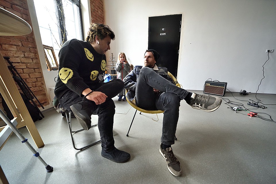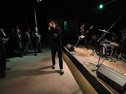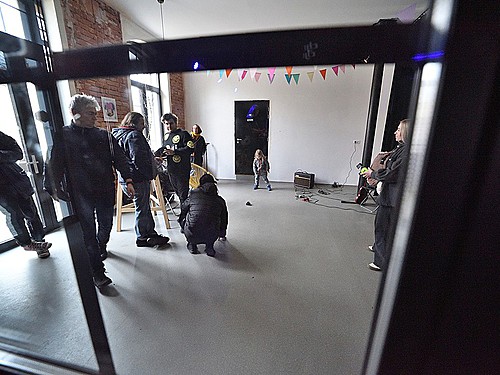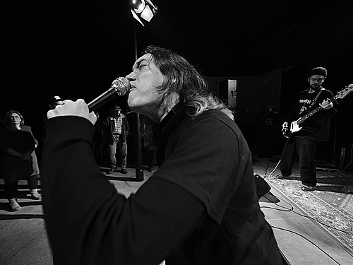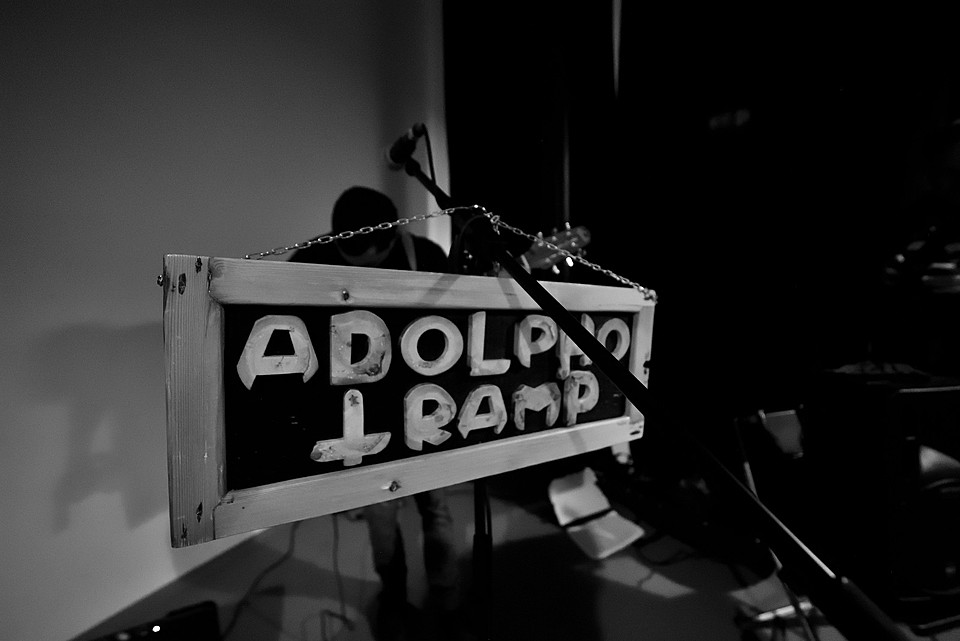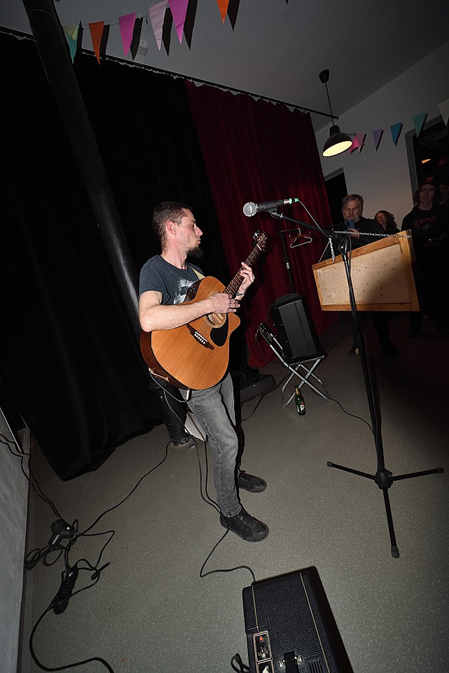 V době zvukovky dalších REK v předsálí se svou akustickou kytarou burcuje Adolpho Tramp.