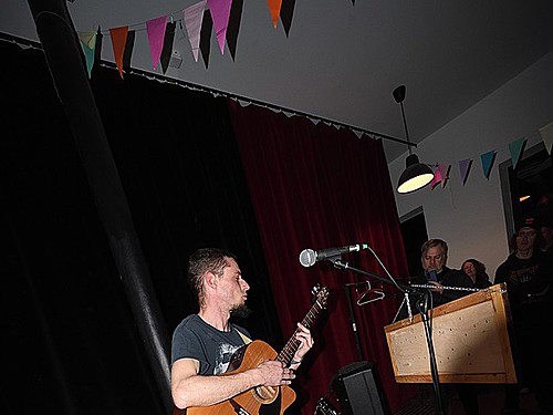 Line-up festu čítal celkem 12 skupin, tandemů & solitérů. Plus jakási předkapela. Píšu jakási, protože v době, kdy plácám pětibábou na stolek u vstupu, to už měla za sebou. Aby se porce muziky vtěsnala do striktních osmi hodin (14-22 hod.), hrálo se na hlavní stejdži a v době, kdy se formátovala další kapela (což netrvalo déle jak 15 minut!), hrál ve dveřmi odděleném předsálí (vestibulu) zatím někdo z trojice „akustiků“, folkoví ŽER TY STRANOU, zasmušilý Filip Nový a sympatický buřič Adolpho Tramp. Účinkující byli rozděleni dle regionu působení do kategorií: jih, západ a Šumava a Pošumaví, což nemělo na nic ani na nikoho lautr žádný vliv.