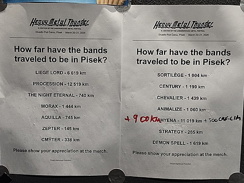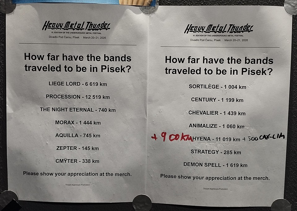 Pozoruhodný statistický přehled visel oba dny na zdi v předsálí. Byly na něm vzdálenosti, z kterých kapely do Písku přijely nebo přiletěly. Samozřejmě to není úplně korektní, co se skutečného přesunu týká, protože některé byly na turné, ale i tak… Peru, Chile, USA, Švédsko, Finsko, Norsko, Francie, Itálie, Německo, Rakousko, Polsko, Slovensko, jen Česko nic. Holt u nás žádná kapela, která by hrála klasický heavy metal, který by se na přehlídku hodil, asi není…