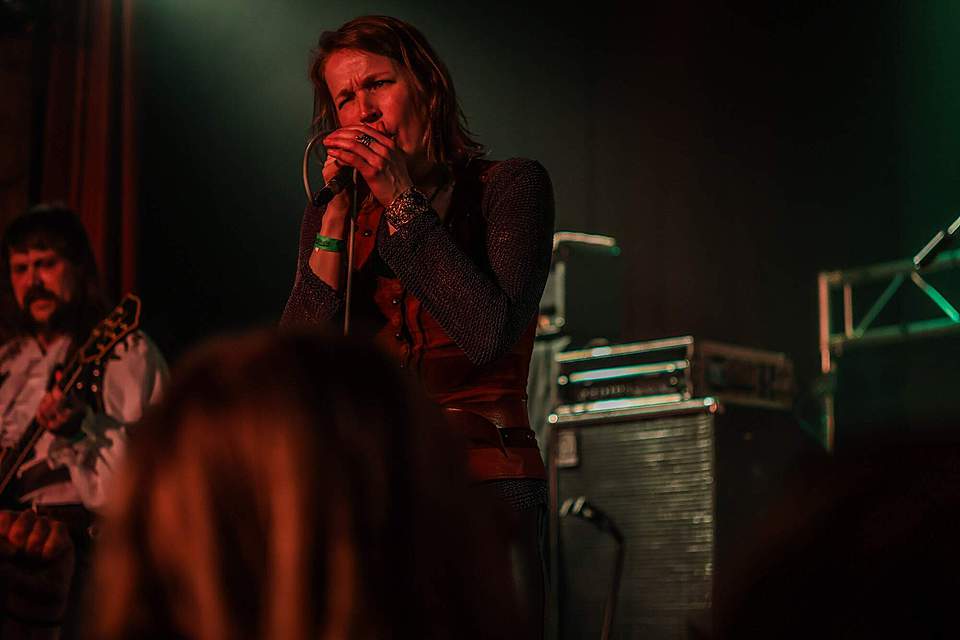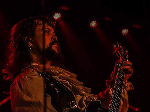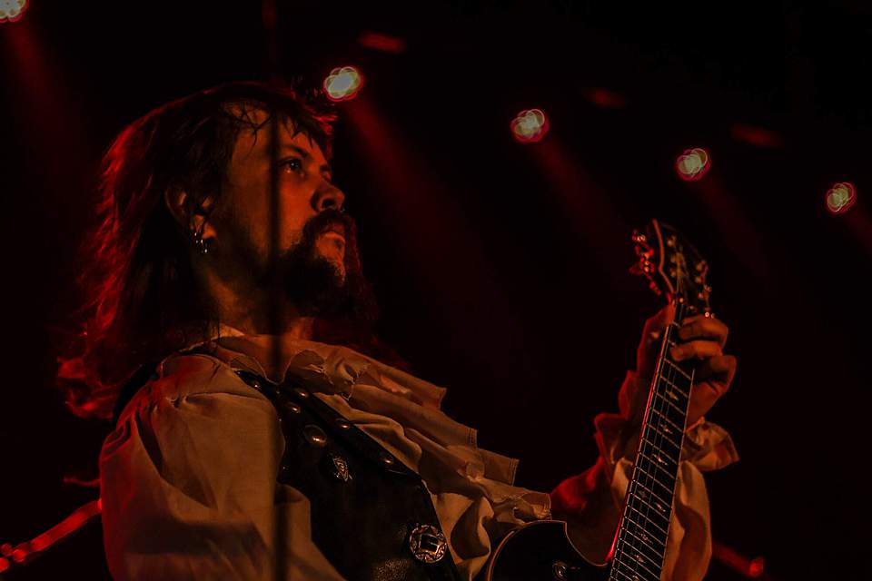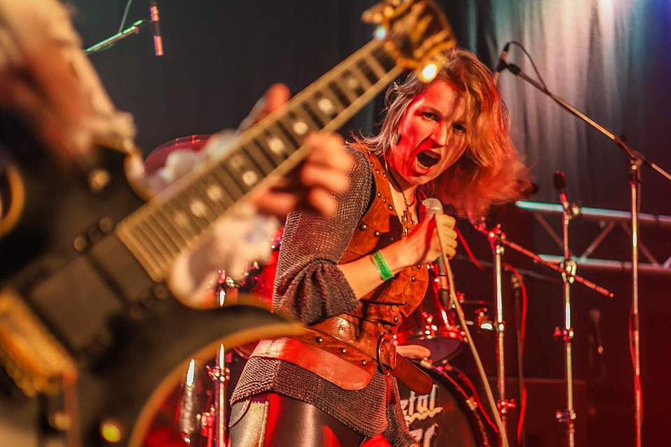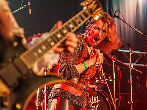 Hned vzápětí se objevila další kapela se zpěvačkou v čele. CHEVALIER přiletěli z Finska a nastoupili v kostýmech, nad kterými zůstával rozum stát, hlavně co se týká obou kytaristů – jejichž visáž… no mrkněte na fotky nebo video. (úsměv) Zpěvačka Emma byla v tomto směru oděná nejlépe, její kostým vypadal historicky a sympatické dámě slušel. A diváky si získala i úsměvy a milým vystupováním, méně už asi hlasivkami. Když je rozvibrovala do výšek, nedalo se jí nic vytýkat, slabší to bylo v normálních polohách, kde jí to místy trochu ujelo. Ono to nebylo snadné ani s muzikou, která byla lehce neurovnaná, melodií moc nebylo, heavy/speed byl lehce okořeněný středověkem, ale mně to úplně do uší nelezlo. Fanoušci ale byli spokojení a dávali to hlasitě i pohyby najevo. Své asi sehrála sympatická zpěvačka…
