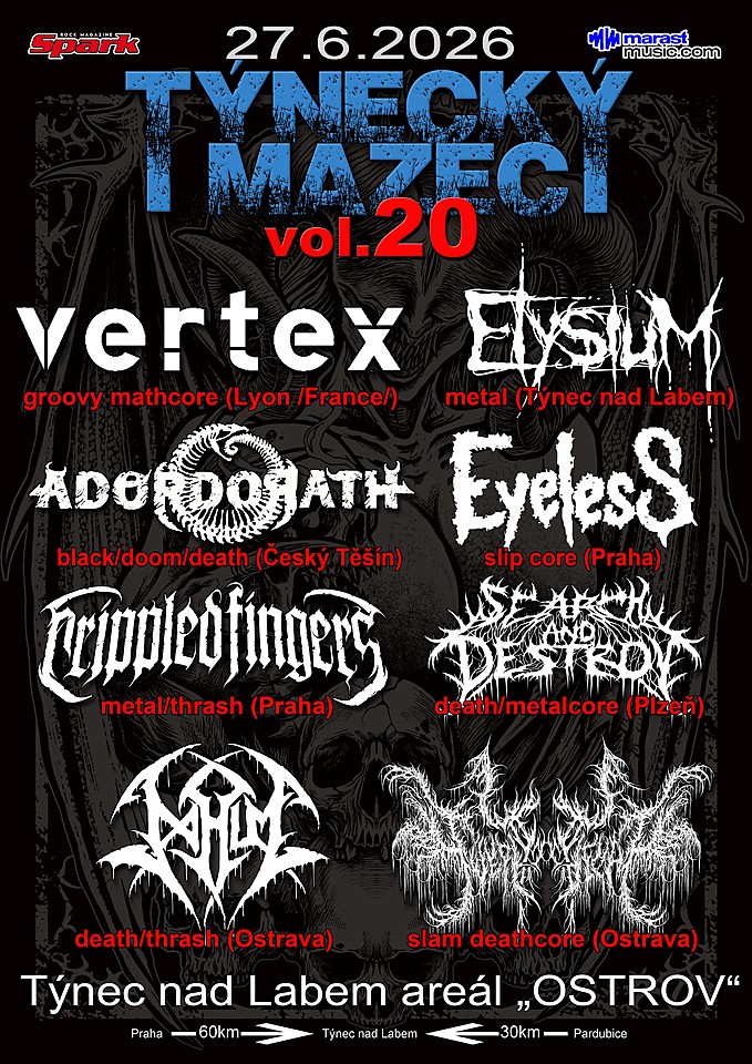 Kompletní soupiska festivalu: VERTEX /FRA/, ADOR DORATH, ELYSIUM, CRIPPLED FINGERS, NAHUM, SEARCH AND DESTROY, SWEPT INTO DECAY, EYELESS