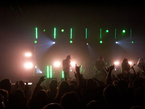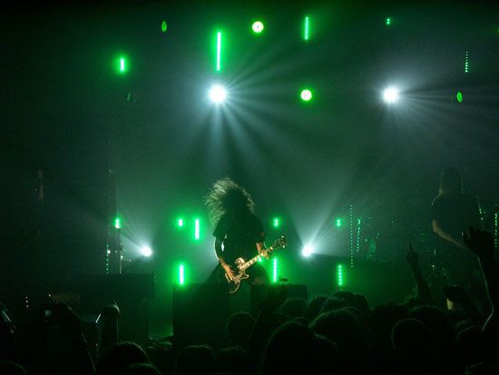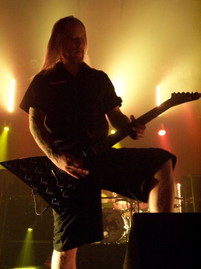 Závěs s prvními tóny spadne a IN FLAMES se nám představují v celé své kráse. Bez úvodu, bez řečí, opěvovaní Švédové rozjeli své vystoupení a v hale už je opravdu nedychatelno. Jelikož se jedná především o podporu alba "Come Clarity", hned mezi prvními skladbami zaznívá např. pecka Leeches. Od počátku musím říct, že vystoupení IN FALMES je moje krevní skupina. Ne snad, že bych byl jejich oddaným fanouškem, ale pódiový projev, zvuk, profesionalita atd., to jsou perfektně zmáknuté atributy show, před níž musím hluboce smeknout. Na pozadí hrající background dokonale dotváří atmosféru a zpěvák Anders zpívá jak o život. Zmíněné pozadí, jestli se nemýlím, obsahuje také vokály. Hraje se především z posledních třech desek a hraje se stále. Kapela téměř nekomunikuje s publikem a sype stále dál skladby, jako např.: Reroute To Remain, Take This Life, System, Black & white, atd. Co bych rozhodně nečekal, tak titulní věc "Come Clarity". Když jsem ale uslyšel první tóny této hodně pomalé věci, tak jsem byl trochu škodolibě zvědavý, jak se s tím Anders popere. Brzy mi sklaplo a musel jsem uznale pokývat hlavou. Nutno konstatovat, že ne omylem jsou IN FLAMES tím nejlepším co světová metalová scéna nabízí.