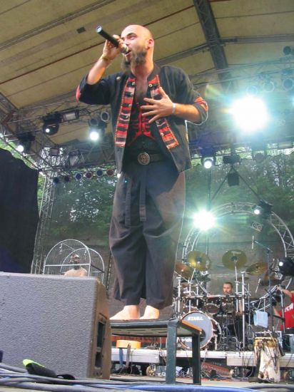 DIE APOCALYPTISCHEN REITER - fucking heavy metal ruleeeeezzzz!! Odlehčení po všech těch mlýncích, smrťácích a černokněžníkách. Super vystoupení ve svižném tempu, které jako by nabilo unavené fans energií na další smrtící jízdu. Ze začátku to sice vypadalo na docela propadák, ale pak šla úroveň skokově nahoru. Lidi se bavili a dokonce jich pár mělo tu čest osobně. Sličná dívčina skončila po taneční vsuvce v kleci a dva "námořnící" na zemi pod pódiem. Právě oni měli v poslední písni "doplout" na gumových člunech po lidech až ke zvukaři. Nedopluli nikam, vyklopili se záhy po skoku do lidí.:)) Dobrá show, někdy až snad schválně klišovitá....ale i tak, super! (Corbow) Tak tohle může vzniknout opravdu jen v Německu... (Goro)