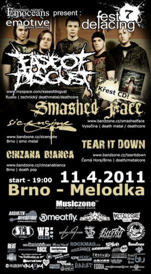 I přes nešťastnými okolnostmi zrušené lednové vydání Defacing Festu pokračuje tradice tohoto podniku samozřejmě i nadále a křest očekávané nové desky vysočinských zabijáků SMASHED FACE se tak vynuceně odsouvá až na dubnové sedmé volume festivalu, které proběhne opět za účasti vybraného lineupu pětice kapel. Headlinerem sedmého vydání totiž budou brutální deathmetaloví řezníci EASE OF DISGUST z Ruska. Ti zcela nepochybně srovnají brněnskou Melodku se zemí silou nevídanou, přičemž půdu k tomuto bohulibému činu jim kromě zmíněných oslavenců připraví prověřená jistota v podání zavedené formace SIC.ENGINE za asistence nadějných supportů CINZANA BINCA a TEAR IT DOWN. Pojďme si nyní jednotlivé soubory představit podrobněji: