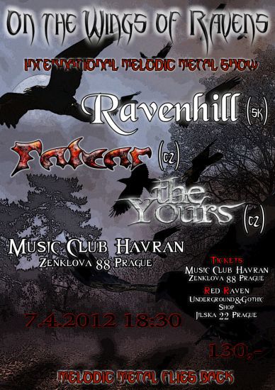…nová vlna melodického metalu přilétá na havraních křídlech…Pražský Music Club Havran pohostí v sobotu 7. dubna 2012 tři ambiciózní melodic metalové formace. Jako zahraniční host přijede z Bratislavy skupina Ravenhill, domácí scénu budou zastupovat The Yours z Vlašimi a kladenští Falcar.
