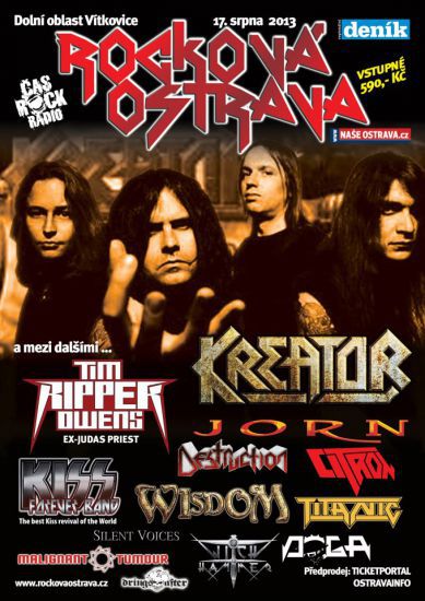 Festival Rocková Ostrava, který se uskuteční v sobotu 17.8. 2013 v Dolní oblasti Vítkovic, dokončil všechny učinkující kapely a tak v síti TICKETPORTAL je možno si zajistit vstupenky v ceně 390 ,- Kč. V den konání festivalu bude cena 800 Kč,- takže věříme, že fanoušci využijí možnosti získat vstupenky za solidní cenu. Máme potvrzeny všechny skupiny a to : CITRON – po 25 letech od vydání CD Radegast ho kompletně skupina zahraje v Ostravě, skupina KISS FOREVER z Maďarska, která je hodnocena jako nejlepší revival na světě, TITANIC – brněnská legenda, která v Ostravě bude křtít nové CD, vynikající norský hardrockový zpěvák JORN, který se do Ostravy velice těší, DOGA – která v letošním roce oslaví 25 let od svého založení, domácí MALIGNANT TUMOUR – půjde o jediný koncert této kapely v Ostravě v letošním roce, SILENT VOICES – finská formace poprvé v Ostravě s klávesistou Henrikem Klingbergem ze skupiny SONATA ARCTICA, WITCH HAMMER – mladí dravci z Jablunkova, DRINGS AFTER – ochutnávka toho nejlepšího z rockové klasiky, WISDOM – možné velké překvapení festivalu z Maďarska, TIM RIPPER OWENS – bývalý zpěvák skupiny JUDAS PRIEST, který se do ČR vrací po roce na jediný koncert v Ostravě, DESTRUCTION - kapela, která oslaví 30 let výročí od svého vzniku a hlavní hvězdou bude KREATOR – německá legenda, která v Ostravě naposledy vystoupila před 18 lety.