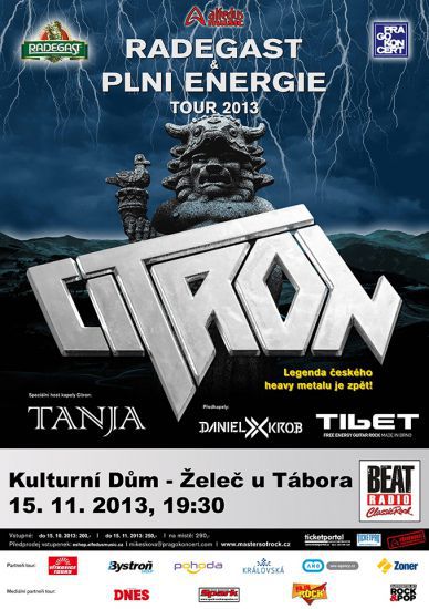 Kapela, která zaplnila na jaře tohoto roku sedm sálů, z nichž většinu vyprodala a svým oddaným příznivcům slíbila, že se ještě letos na pódia vrátí. CITRON - Fany Michalík, Jarda Bartoň, Jirka Šperl, Vašek Vlasák a Radim Pařízek - slib plní a po obrovském úspěchu oznamují druhou část svého úspěšného „Radegast a Plni energie Tour 2013“. V rámci koncertní šňůry zavítají také na jih Čech, kde 15. listopadu vystoupí v KD Želeč u Tábora.
