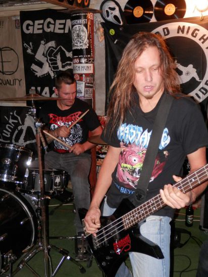 A protože se na Garáži musí končit v deset večer, BRUTALLY DECEASED na sebe nenechali dlouho čekat. Kdo tuhle partu někdy viděl, ví moc dobře, co umí. Každý fanda švédského old school death metalu musí být ve střehu a mlátit šiškou. BRUTALLY DECEASED zválcovali Garáž chorobným, chřestivým a autentickým death metalem té nejvyšší kvality. Ano, kapela už nějakou dobu zní „světově“ a dokazuje to i na splitku se Švédy INTERMENT. V set-listu nechyběly ani připravované vály. Jedna skladba ve stylu ENTOMBED, druhá GRAVE, další DISMEMBER…, ale i vlastní ksicht BRUTALLY DECEASED. Jednoznačná špička tuzemského death metalu vládla celé Garáži. Pravověrným punx asi death metal tolik nevoněl, ale circle pit okolo sloupu se musel páčit každému! (Peťan)