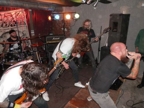 Na první benzině na české straně si dáváme svačinku a kafíčko. Mezi Hradcem a Trutnovem projíždíme kolem čerstvé dopravní nehody. Auto ve škarpě, zaklínění lidé uvnitř a několik policistů poskakujíc kolem, nic pěkného. Po 6. hodině jsme v Trutnově. Projíždíme kolem areálu Bojiště, zvláštní pocit. Tolik let jezdíme na Obscene Extreme a nikdy jsme se nedostali dál než na druhou benzinku za areálem. (smích) Dojedeme se ubytovat do hotelu Krakonoš, který je součástí pivovaru. Moc dlouho si neodpočineme a hned se zas pakujeme a jedeme na místo konání dnešního koncertu. Kabinet je útulná hospoda, v jejíchž sklepních prostorách se nachází ideální prostor pro konání underground koncertů.