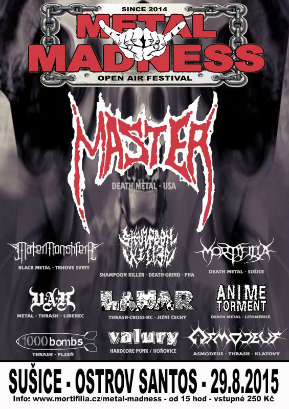 Přímo v úpatí brány Šumavy – Sušice loni vznikl slibný festival Metal Madness, který letos pokračuje. Druhý ročník tolik úspěšné akce letos navyšuje nabídku kapel o další dva kusy. Můžete se těšit na osvědčené a chválené vlastnosti této akce. V první řadě jde o výtečný výběr kapel, kterým tentokrát vévodí americká sebranka Master! O povedený zvuk se postará Jirka Vítovec, tedy osoba, která sklízela chválu za kroucení zvukařskými čudlíky už loni. Jistotou a kvalitou zůstává i místo konání, kterým je areál ostrovu Santos. Ten nabízí kulturní vyžití i pro nejmenší návštěvníky, kteří mají vstup zdarma. Vstřícná a pohotová obsluha bude k mání i letos, stejně jako sociální zázemí na slušné úrovni (žádné toiky, ale zděné toalety). Nabízí se i přespání v nedaleké chatové osadě Luh/Jitřenka, což mnohým přespolním přijde nepochybně vhod. Neváhejte využít rozmanitých možností kolem tohoto festivalu! Jedinou změnou bude jemné navýšení vstupného o cca padesát korun. Takže opět půjde o pohodový zážitek se všemi zajetými standardy a kvalitami made in Metal Madness.