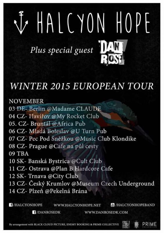 Celkem deset zastávek čítá nadcházející československé turné dánské alternativní kapely Halcyon Hope a osobitého muzikanta Dana Rose. Neotřelý zážitek čeká fanoušky například v Plzni, Mladé Boleslavi, Praze či Českém Krumlově. Dva koncerty Halcyon Hope a Dan Rose odehrají i na Slovensku – 10. listopadu v Banské Bystrici a o dva dny později v Trnavě. Turné startuje 4. listopadu v havířovském klubu My Rocket.