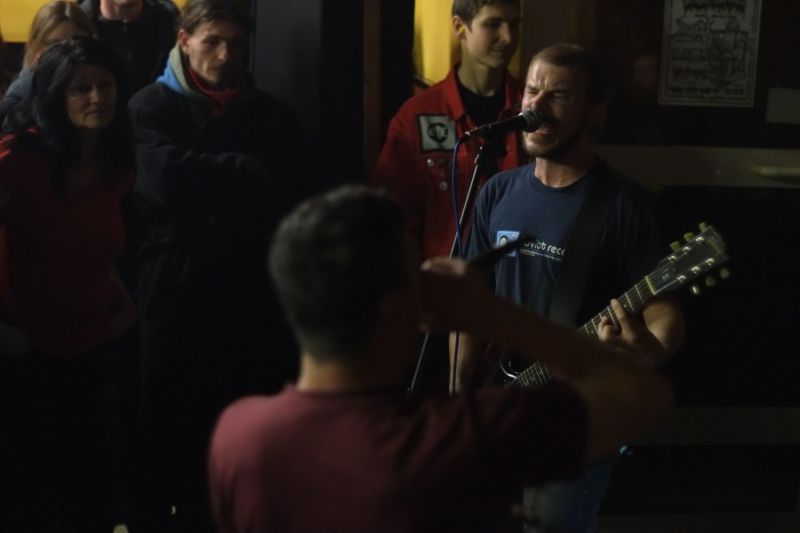 Co se týká počtu lidí, tak bych tipoval dobrou stovku příchozích, prostor byl úplně plný, místo mezi muzikanty a přihlížejícími nebylo prakticky žádné... SVINĚ! to taky rozjeli ve velkém stylu, hardcore v jejich podání mě nějakých dvacet minut bavil hodně, i když opět se nedařilo udělat zvuk tak, aby bylo rozumět zpěvákovi... Ten se na neviditelném pódiu (žádné v Jiskře není) nemohl udržet a vydal se i mezi lidi, až se někteří divili, kdo že to kolem nich řve do mikrofonu... Po oněch dvaceti minutách mě ale skladby začaly splývat a hrací čas, možná třičtvrtěhodinový, mi přišel příliš dlouhý.