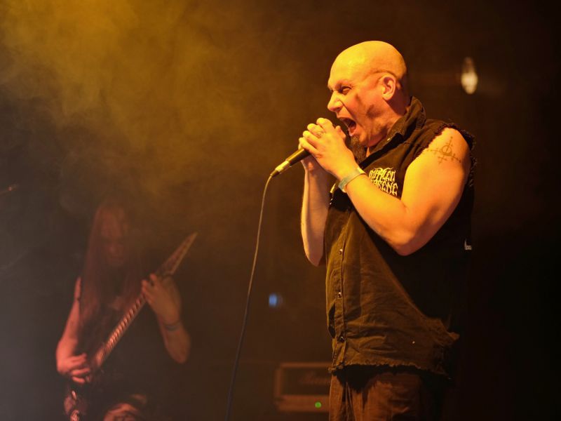 Italské kapely letos ETEF ovládly - první z nich byli death metalisté DISTRUZIONE. Jednalo se pro mě o nové jméno a den před akcí jsem si letmo poslechl dvě skladby. Naživo mě pak jejich old school death metal švédského střihu nadmíru bavil. Nechyběly pomalejší pasáže, přímočaré vyhrávky, chorobný vokál a hodně sympatický projev. Žádní mladíci, ale podle vizáže už ostřílení borci. DISTRUZIONE za nějakých čtyřicet minut spláchli Volyni sice stokrát slyšeným, ale kvalitně zahraným death metalem. Staromilci si museli chrochtat blahem a já patřil mezi ně. (Peťan)