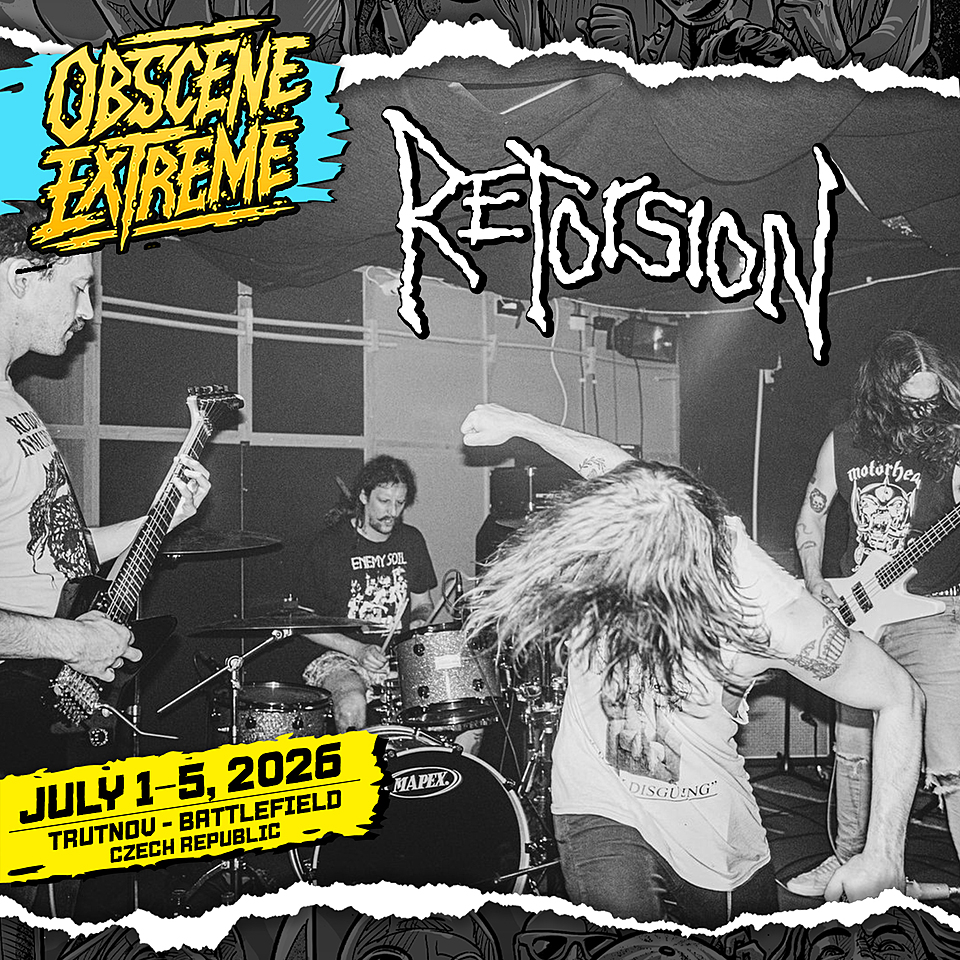 MEGATUNA GRINDCORE!!! Jednou z dalších kapel, která si odbude svou premiéru na Obscene Extreme festivalu, budou tito čtyři zabijáci z maďarské Budapešti – RETORSION!!! Pokud se zajímáte o ten skvělý styl, který všichni milujeme a kterým je old school grindcore, neměli by vám být RETORSION úplně neznámí. Jejich první demo "Elve Rohadás" totiž solidně rozčíslo vody zatuchlého undergroundu. Naprosto dechberoucí grindcore, podobný zakladatelům stylu Repulsion, ale nečekejte žádnou kopírku – RETORSION mají svůj ksicht a energii, s níž nakládají, je ekvivalentem megatunové atomové bomby!!! Kluci pochopitelně taky hodně koncertují a na cestě je vydání první dlouhohrající desky, které se nemůžeme dočkat!!! Černí koně OEF 2026? To budou rozhodně tito drtiči!!! RETORSION – zapamatujte si jejich jméno, ještě o nich hodně uslyšíme!!!