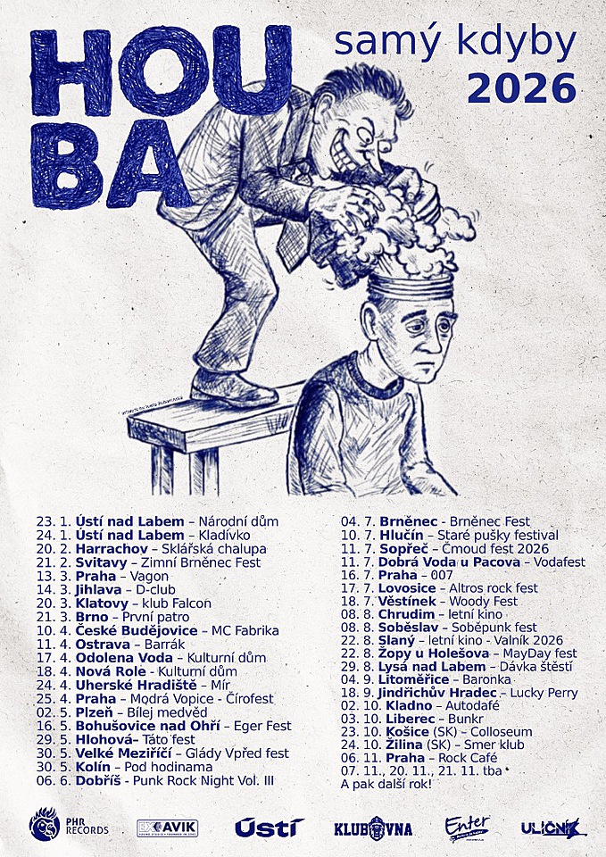 Ústecká kapela Houba v lednu oslaví 31 let na scéně a v roce 2026 vydá novou desku. Nový singl „Samý kdyby“ během měsíce zaznamenal 50 tisíc poslechů.„V lednu zahrajeme tak trochu už tradičně dvojkoncert v Ústí pod Labem, v pátek 23. 1. v Národním domě, o den později v klubu Kladívko. Novej singl ukazuje směr, kterým se budeme vydávat. Druhou část desky natáčíme v únoru 2026“, říká Martíček, basák kapely.