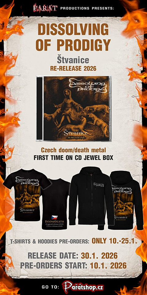 Předobjednávky CD DISSOLVING OF PRODIGY – Štvanice (re-release 2026) plus speciálních triček a mikin k tomuto vydání, byly v Pařátshopu spuštěny 10. ledna. Pánská trička v 7 velikostech a pánské mikiny zipovky s kapucí v 6 velikostech jsou tradičně “pouze” na předobjednávky do 25. ledna. Po tomto datu se brána uzavře a dotisk nebude možný.