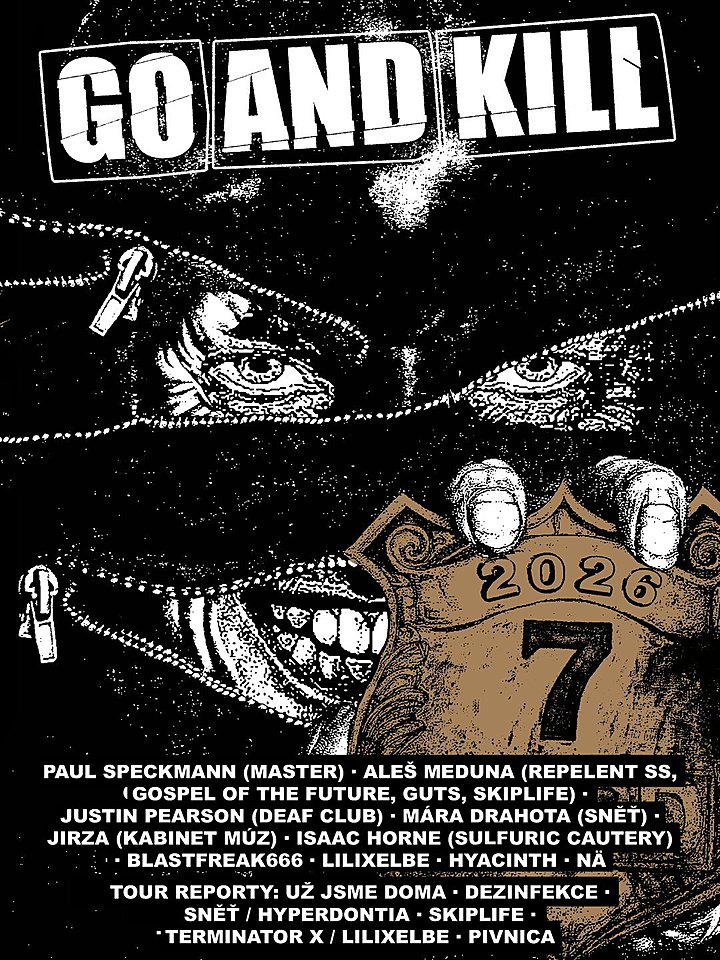 Sedmé číslo fanzinu GO AND KILL vychází v březnu 2026. Na 230 stranách formátu A4 přináší rozhovory, tour reporty i pohledy na aktuální dění na DIY scéně doma i v zahraničí. Rozhovory tentokrát poskytli legendární Paul Speckmann z MASTER, jedinečný Justin Pearson (DEAF CLUB, ex-THE LOCUST, Three One G label), Aleš Meduna v rozsáhlém povídání o svých aktuálních kapelách GOSPEL OF THE FUTURE, GUTS, SKIPLIFE a REPELENT SS i o zážitcích z koncertních šňůr, Mára Drahota (SNĚŤ), spolupořadatel koncertů pod hlavičkou Kreas Promotion a festivalu Tones of Decay, stojící také za značkou FURY M&S Production, a Jirza nejen o brněnském klubu KABINET MÚZ a fungování nezávislé klubové scény. Zajímavý pohled přináší také Kristof Grabowski alias BLASTFREAK666 z Německa – vášnivý sběratel vinylů, který měsíčně pořídí kolem 50 desek a pravděpodobně vlastní největší sbírku vinylů Napalm Death na světě. Isaac Horne, jeden z nejrychlejších bubeníků současnosti, vypráví o čerstvé krvi na grindcore scéně i o svých kapelách SULFURIC CAUTERY a MORGUE BREATH. Mladou krev zastupují plzeňské kapely – powerviolence duo LILIXELBE a hardcoristé HYACINTH. Nechybí ani naštvaný hardcore/punk z Banské Bystrice v podání NÄ. Tour reporty tradičně tvoří výraznou část obsahu. Své zážitky z cest sdílejí UŽ JSME DOMA z turné po Francii a Polsku, SNĚŤ a HYPERDONTIA ze společné jízdy po Anglii, TERMINATOR X a LILIXELBE z evropského turné, PIVNICE z výjezdu po Pobaltí a také DEZINFEKCE a SKIPLIFE z turné po dalekém Japonsku. Scene report ze Slovinska mapuje aktuální renesanci tamní powerviolence scény. Závěr čísla tradičně patří pravidelným sloupkům. Obálku vytvořil Hynek Sýkora. Náklad je omezen na 250 kusů.