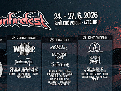 - Čtvrteční program (25. 6.) přinese jeden z největších taháků historie festivalu – návrat heavymetalových ikon W.A.S.P. pod vedením Blackieho Lawlesse. Den plný legend doplní projekt Death to All, vzdávající hold Chucku Schuldinerovi, thrashové legendy Forbidden nebo domácí gotická špička XIII. Století. Temnější atmosféru podtrhnou američtí Uada či moderní deathcoroví Distant.